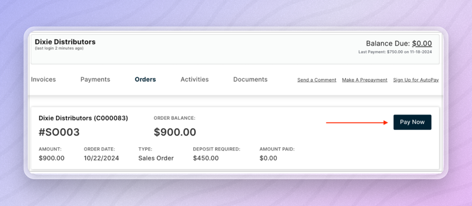 Now, we’ve added a Pay Now button to the Order Detail page (as shown below) in the Customer Portal. When customers click the Pay Now button, they will be directed to the Order Deposit page (second image), where they can pay.
