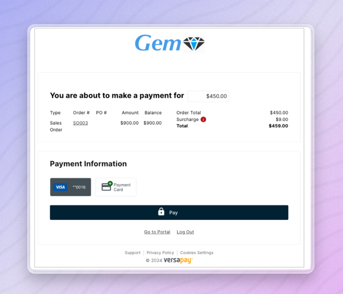 Signed-up customer users (those who’ve set up a username and password) can make an order deposit payment by selecting from the available saved payment methods or by adding and saving a new payment method. These users can also re-enter the portal or log out of the customer portal from the page (see links at the bottom).
