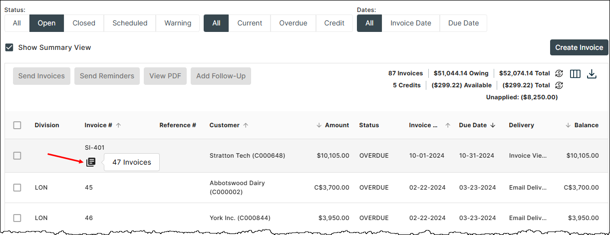 In Collaborative AR, this is referred to as a Summary Invoice, and it mirrors the NetSuite Group Invoice for consistent handling across platforms. A summary invoice has a special icon as shown below on the Invoices listing page, and hovering over the icon shows the number of invoices in the group.